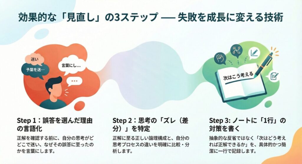 <div class=”important-box”> <div class=”box-title”>効果的な「見直し」の3ステップ</div> <ul> <li><strong>Step 1:</strong> 正解を見る前に、「なぜ自分はこの誤答を選んだのか」を言語化する。</li> [cite_start]<li><strong>Step 2:</strong> 正解と自分の思考プロセスの「ズレ(差分)」を特定する。</li> <li><strong>Step 3:</strong> 「次はどう考えれば正解できるか」をノートに1行で書く。</li> </ul> </div>