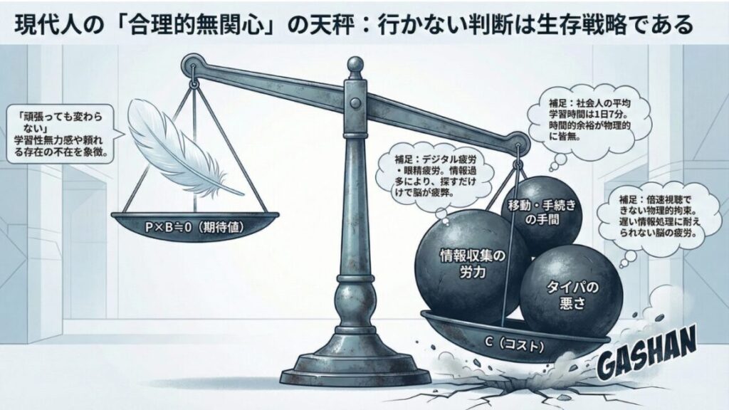 まずは、あなたの「行かない」という判断がいかに論理的か、証明してやろう。